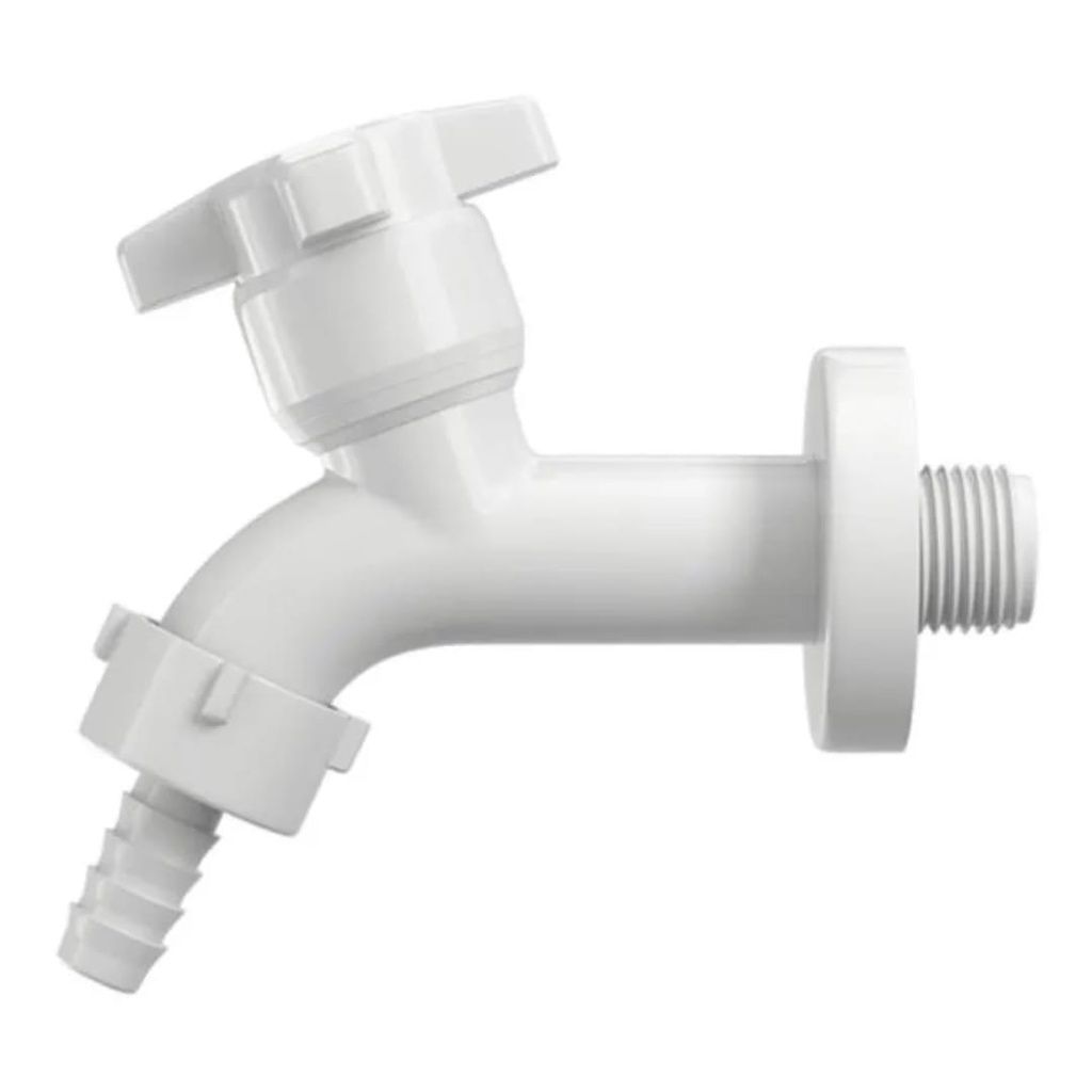 Conteúdo da embalagem 1 Torneira Uso Geral Parede, 1 Canopla, 1 Bico para Mangueira e 1 Redutor de 3/4 para 1/2